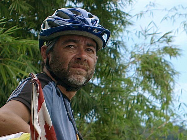 C’était en fin d’après-midi, j’ai vu un cycliste s’arrêter dans mon “soi” (petite rue en thai) et interroger les ouvriers qui travaillaient en face de chez moi. J’habite une station balnéaire et il n’y a dans mon soi que des maisons à louer pour le week-end ou à plus long terme. Le cycliste semblait chercher un endroit pour dormir, et les ouvriers, qui ne parlaient pas anglais bien évidemment, l’ont dirigé vers moi pour que je puisse l’aider. Je me suis approché et j’ai constaté que je n’avais pas affaire à un cycliste amateur. Le casque vissé sur la tête, de grosses sacoches fluorescentes flanquées de part et d’autre du vélo, une carte déroulante fixée au guidon, notre homme venait manifestement de loin. Mais d’aussi loin, ça je ne l’imaginais pas.