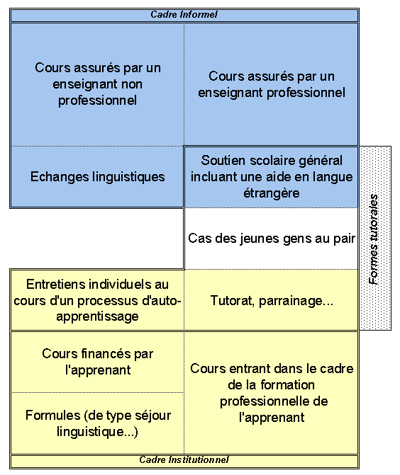 Nous proposons ici un tableau, probablement non exhaustif, récapitulant les différentes formes de cours particuliers que nous avons passées en revue. On voit que les critères de classement varient selon le cadre dans lequel on se situe : alors que le critère de l'enseignant est à la base d'une distinction majeure au sein du cadre informel, c'est plutôt le type de formule qui commande les distinctions du cadre institutionnel. Cette dernière classification n'est d'ailleurs pas étanche : on peut imaginer le cas d'un apprenant finançant lui-même des cours qu'il estime entrer dans le cadre de sa formation professionnelle, et ce lors d'un séjour linguistique à l'étranger.